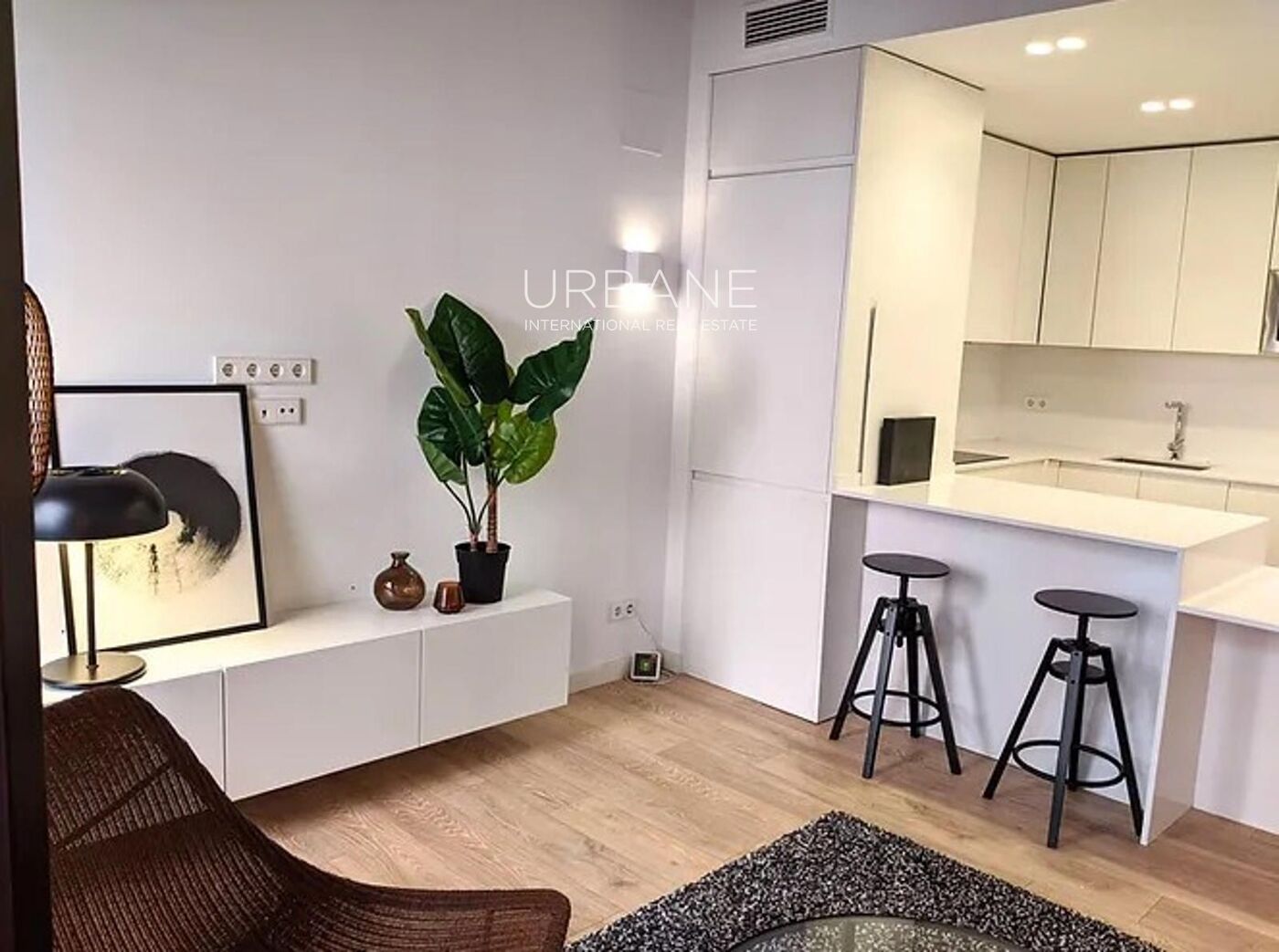 El amplio salón-comedor de concepto abierto se llena de luz natural gracias a los grandes ventanales que conducen a un balcón privado con vistas a la calle Escudellers. La moderna cocina, integrada con estilo, está totalmente equipada con electrodomésticos de alta gama —placa de inducción, horno, microondas, lavavajillas, frigorífico-congelador y espacio previsto para lavadora y secadora—, ofreciendo una combinación perfecta de diseño y practicidad.