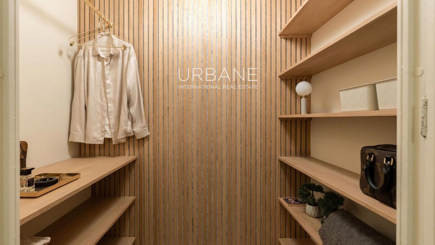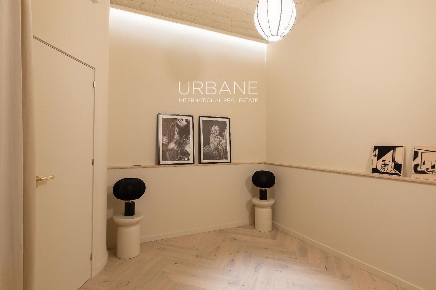 El dormitorio destaca por sus bóvedas catalanas, además del acceso al patio. Incluye un vestidor con paneles acústicos en roble mate y estanterías a medida, oculto tras unas puertas acristaladas originales.