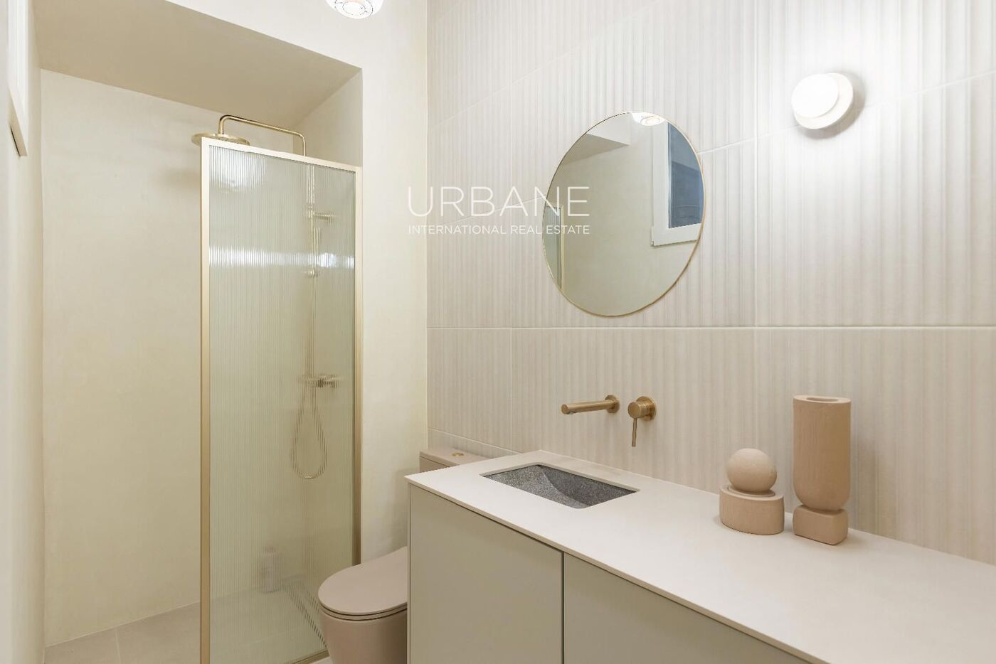 El baño en suite mantiene el mismo nivel de detalle: acabado en microcemento, con detalles en latón, bóvedas catalanas, grifería mural, lavabo de mármol y una mampara en latón con cristal acanalado. También dispone de lavadora integrada.