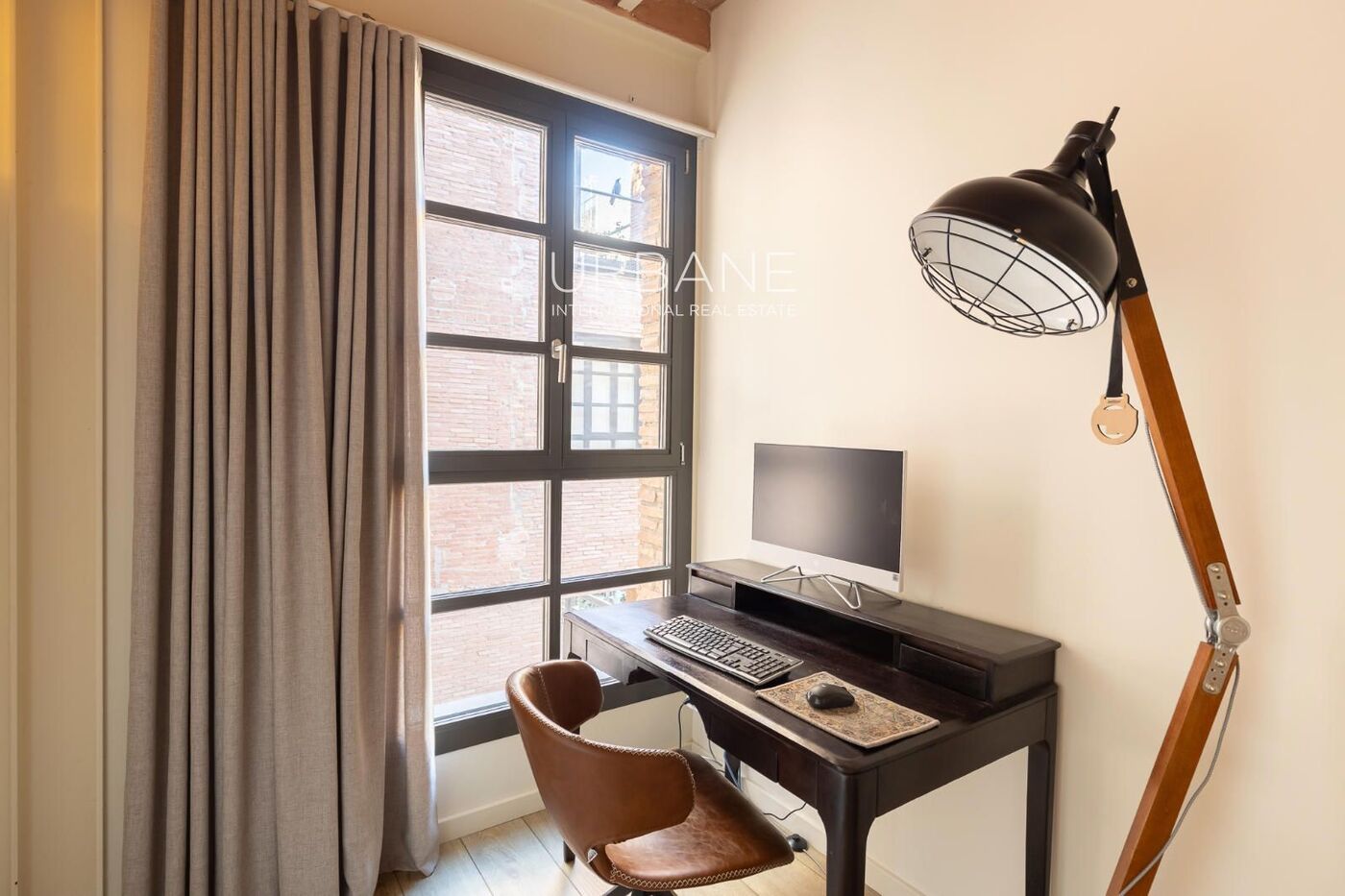 En el interior del apartamento, las tres habitaciones ofrecen un uso flexible: un dormitorio principal, un segundo dormitorio y una tercera estancia actualmente utilizada como despacho, ideal para teletrabajar o desarrollar proyectos creativos sin renunciar al ambiente acogedor del hogar. El corazón de la vivienda es la cocina abierta, que se integra de forma fluida en un amplio salón-comedor. Gracias a los generosos ventanales y a una distribución muy bien pensada, el espacio resulta luminoso, fluido y acogedor. Desde el salón, los grandes ventanales se abren a una encantadora terraza privada, un auténtico lujo en el centro de Barcelona. Esta terraza disfruta de vistas a los frondosos jardines comunitarios y a la zona de piscina, creando un oasis de calma por encima del bullicio urbano.