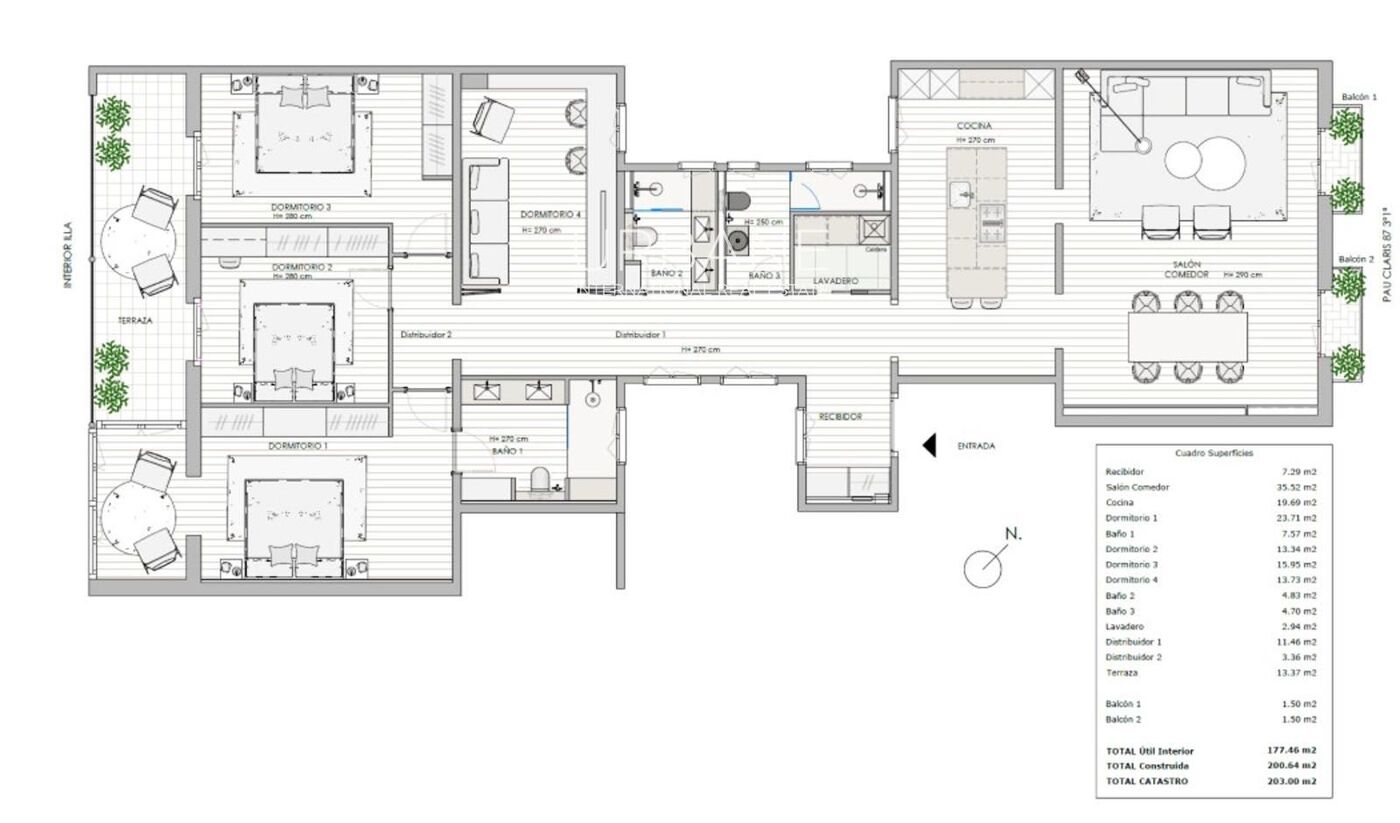 La distribución es muy funcional, con una clara separación entre la zona de día y la zona de noche. Al acceder a la vivienda, un amplio recibidor con armarios a medida y techos elevados anticipa la elegancia y luminosidad del conjunto.