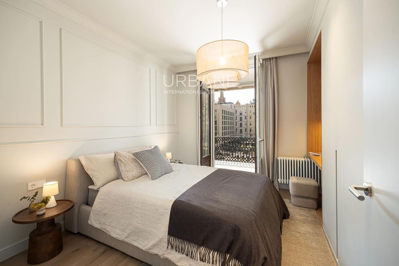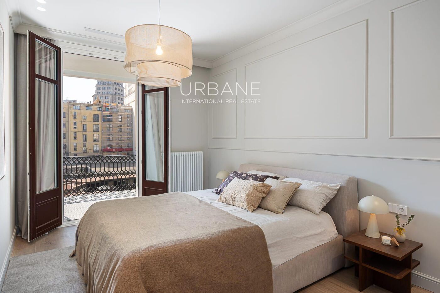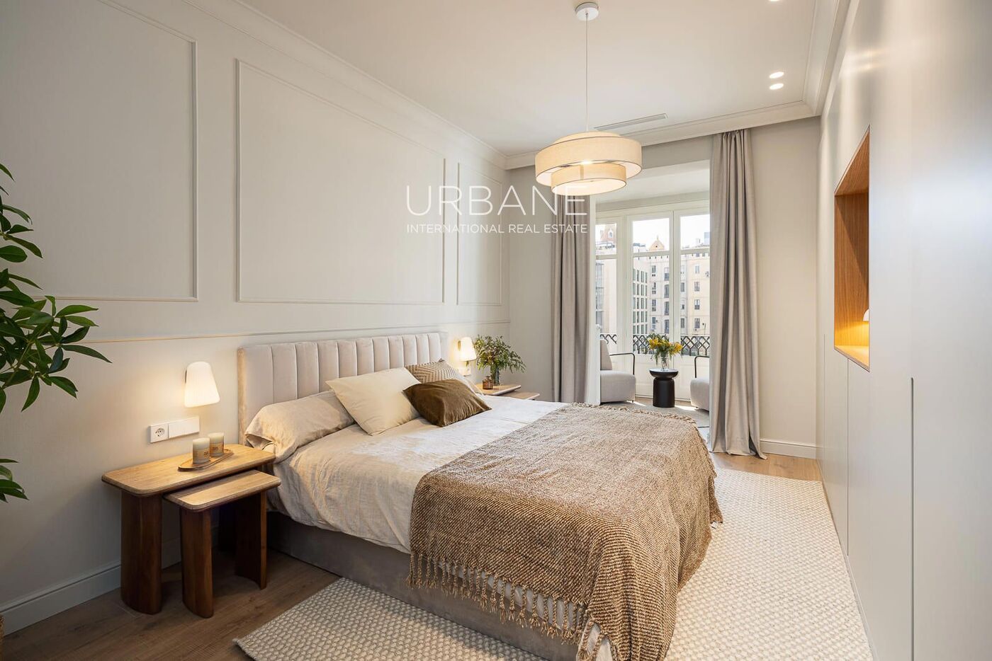 El edificio conserva las proporciones clásicas y la elegancia arquitectónica propias del Eixample, con una fachada señorial con balcones de hierro forjado, techos altos y una composición simétrica que potencia la luminosidad y la amplitud de los espacios. Su doble orientación, con vistas a la calle Pau Claris y al tranquilo patio de manzana, garantiza luz natural durante todo el día, combinando dinamismo urbano y calma.