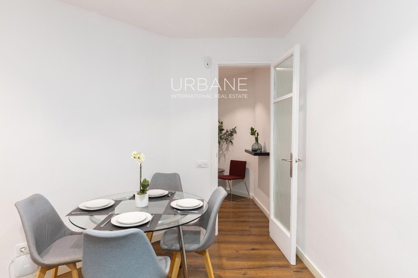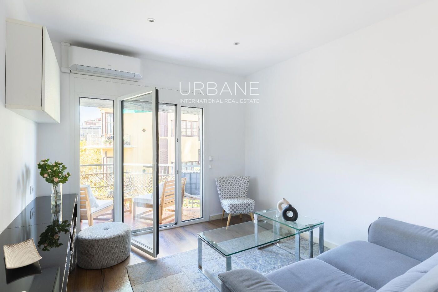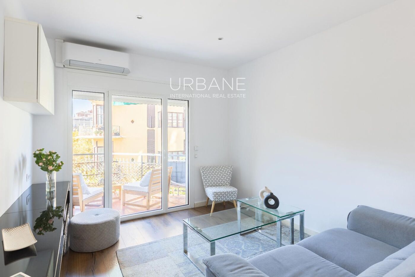 El pis compta amb una àmplia sala d'estar i menjador amb accés a una terrassa privada, ideal per gaudir del clima suau de Barcelona. La cuina moderna està completament equipada amb tots els electrodomèstics essencials.