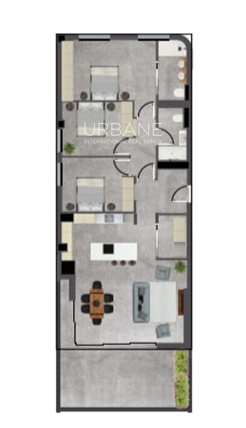 A l'interior, l'habitatge s'estén sobre uns generosos 129,36 m², dissenyats per maximitzar el confort i la fluïdesa dels espais. La distribució inclou tres dormitoris ben proporcionats i dos banys moderns, ideals per a famílies, convidats o per crear un despatx a casa. Grans obertures omplen la llar de llum natural i connecten de manera harmònica amb una terrassa privada, una extensió exterior perfecta per esmorzars tranquils, sopars al capvespre o moments de calma sobre la ciutat.