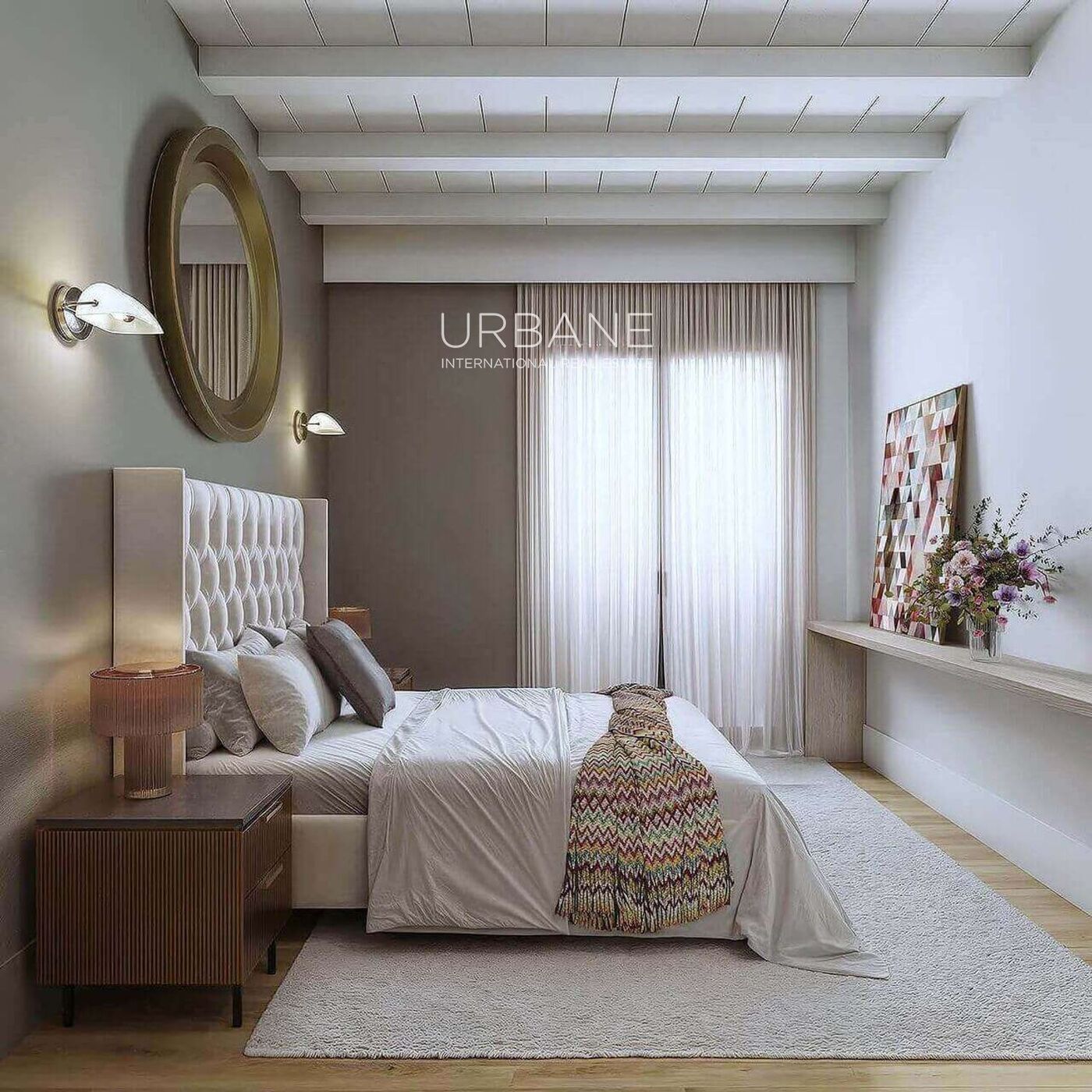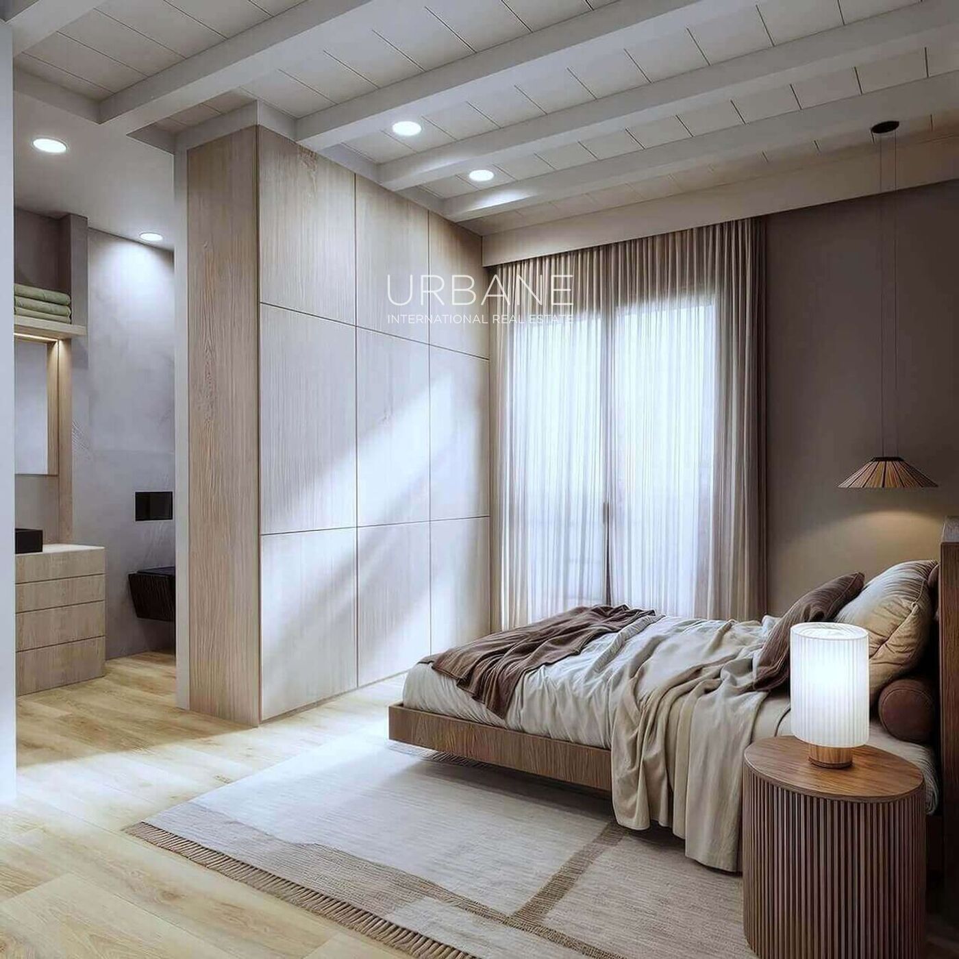 High-end finishes include three-layer oak parquet floors, built-in wardrobes in oak melamine, and solid brick ceilings with exposed white-painted beams, enhancing the apartment's contemporary style. The bathrooms feature microcement walls and oak flooring, with built-in sanitary ware and stylish fixtures for a modern aesthetic.