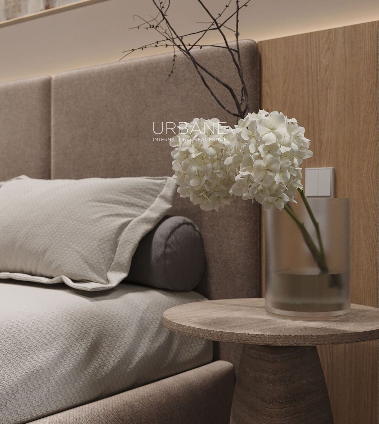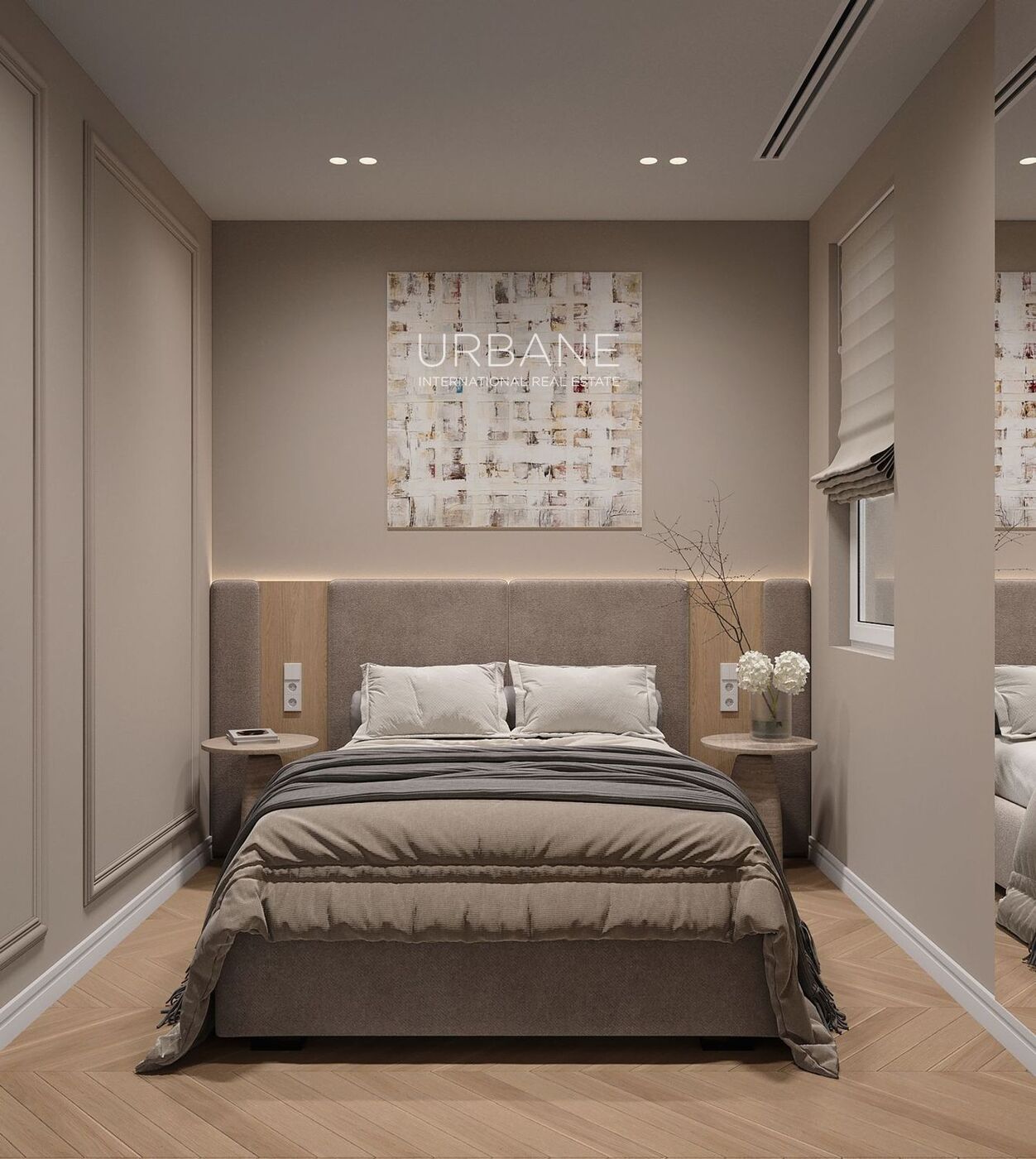 The apartment features three bedrooms, each individually designed to offer maximum comfort. Two of the bedrooms are furnished with spacious double beds, while the third room includes a comfortable single bed. The master bedroom has an en-suite bathroom and a walk-in closet, providing ample storage space. The other two bedrooms feature large built-in wardrobes, optimizing the use of space.
