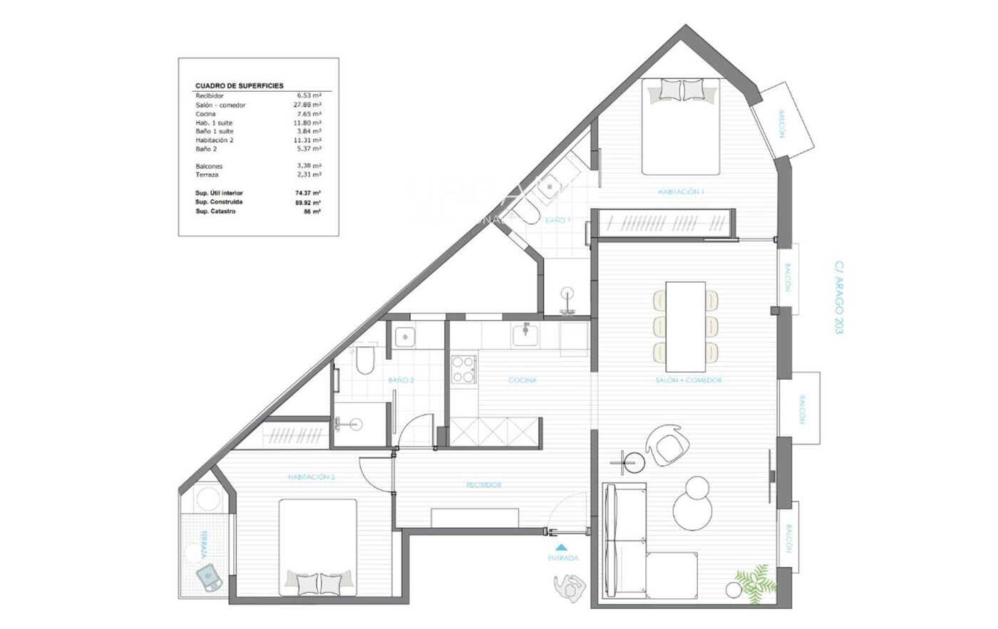 The property features two spacious double bedrooms, both with direct access to outdoor spaces, and two full bathrooms, one of them en suite. With three balconies and one private terrace, the apartment enjoys abundant natural light throughout the day and a seamless connection between interior and exterior living. The generous living and dining area opens onto balconies overlooking Aribau Street, offering pleasant urban views and an inviting setting for both everyday living and entertaining.