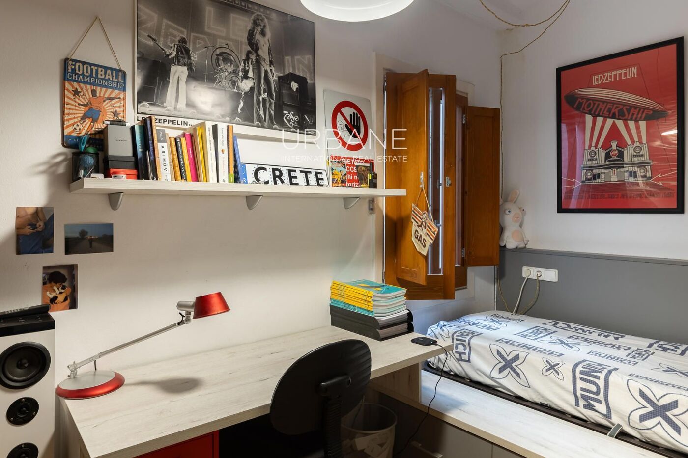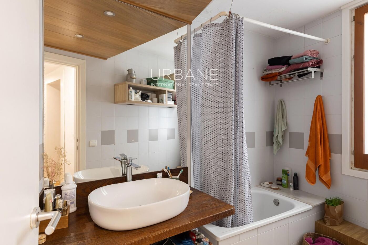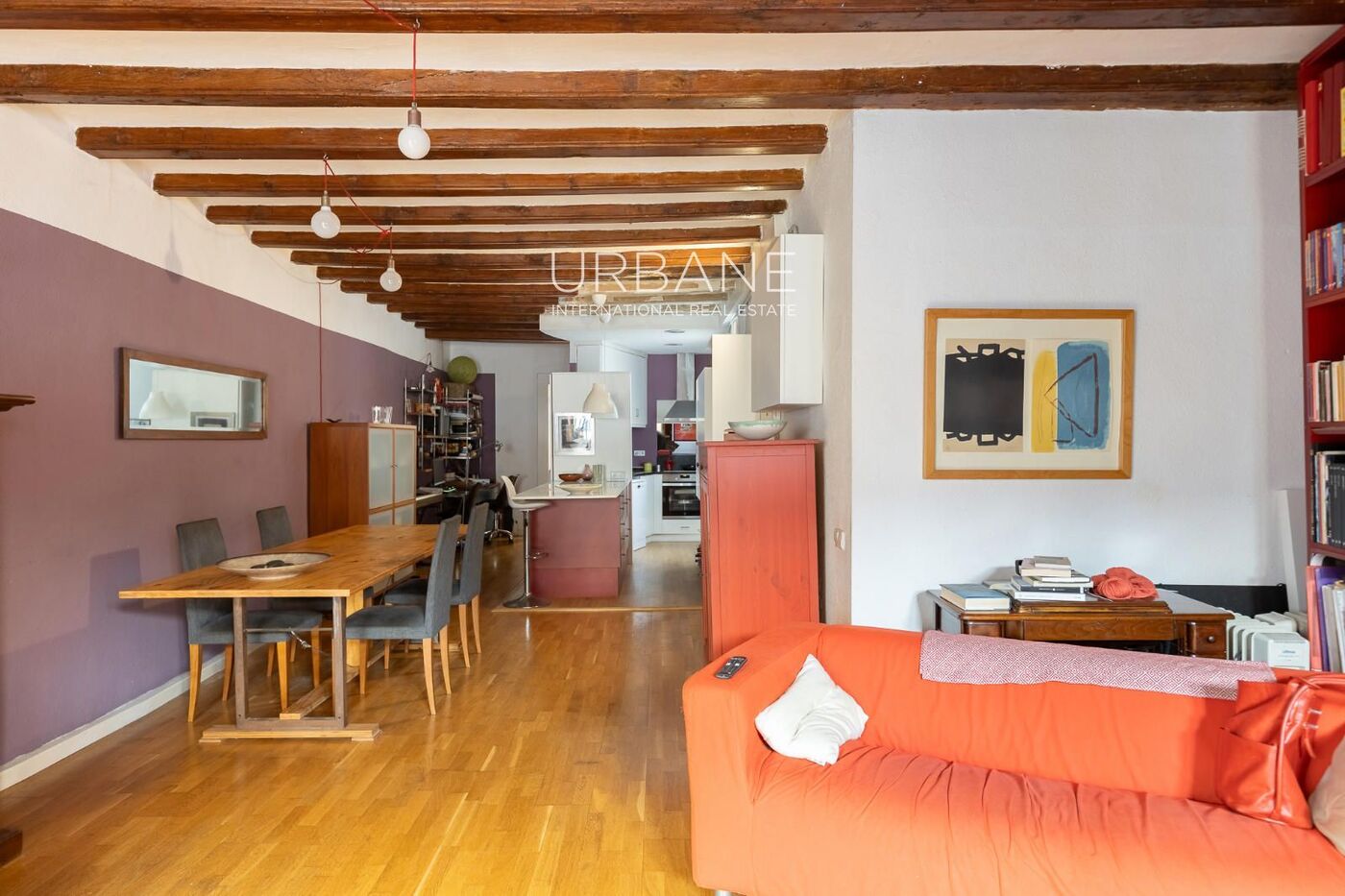 À l'intérieur, le bien séduit immédiatement par son agencement lumineux en espace ouvert. Le salon, la salle à manger et la cuisine s'enchaînent avec fluidité, créant un cadre idéal pour la vie quotidienne comme pour recevoir. Les poutres apparentes en bois apportent chaleur et authenticité, offrant ce charme typiquement barcelonais. Un élégant mur bibliothèque ajoute une touche raffinée, parfait pour exposer livres, œuvres d'art ou objets décoratifs.