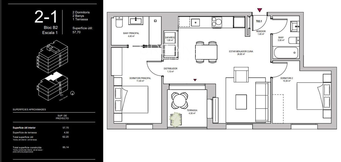 Situé au deuxième étage, cet appartement de 86 m² comprend deux chambres spacieuses et deux salles de bains complètes, idéal pour les familles, les couples ou toute personne recherchant confort et style. Il dispose également d'une terrasse privée de 5 m², parfaite pour prendre le café le matin, se détendre avec un livre ou profiter de la vue sur les jardins communs.